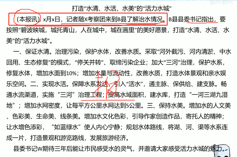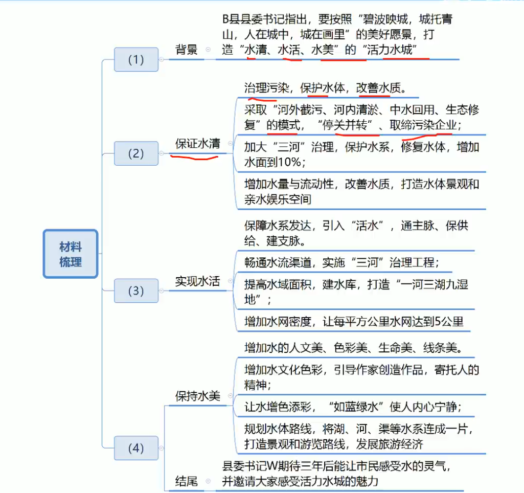 (1)9月15日,在B县县委召开的一次会上,W说: 古语有云:“水者何也?万物之本原也,诸生之宗室也。”择水而居是人类生存的本能,利用水资源又使人类生活更加美好。为此,我县要立足打造“水清、水活、水美”的“活力水城”。要按照“碧波映城,城托青山,人在城中,城在画里”的美好愿景,塑造我县的水系空间,使我们县城的河、湖、湿地合理连接,塑造多样滨水公共空间,达到“水丰、水清、水美、水活”,实现“蓝天、碧水、绿地”相互融合,使“水城”真正充满“活力”。