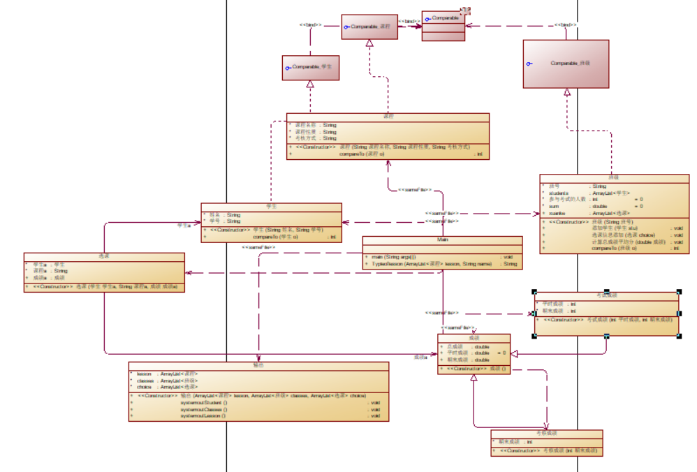 本题我利用到了继承,与Comparable接口。我创建了课程类,学生类,选课类(将学生和课程联系在一起),成绩类,班级类,输出类。其中因为题干所述选修课和必修课的成绩计算方式不同,所以又设计了考试成绩类和考察成绩类分别继承成绩类。