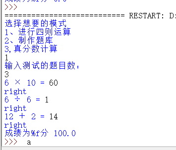 将几个功能分化为多个函数,简单四则运算用一个函数numericalOperation解决,加减乘除用random函数判断,然后给出结果和判断,题库同理,用两个函数将题目和答案收入,在循环完后全部显示出来;真分数的运算还要加入fraction的使用,以及判断是否构成真分数等等