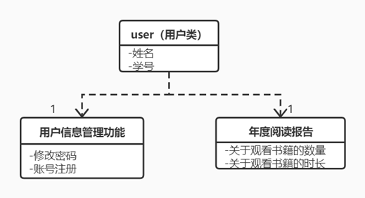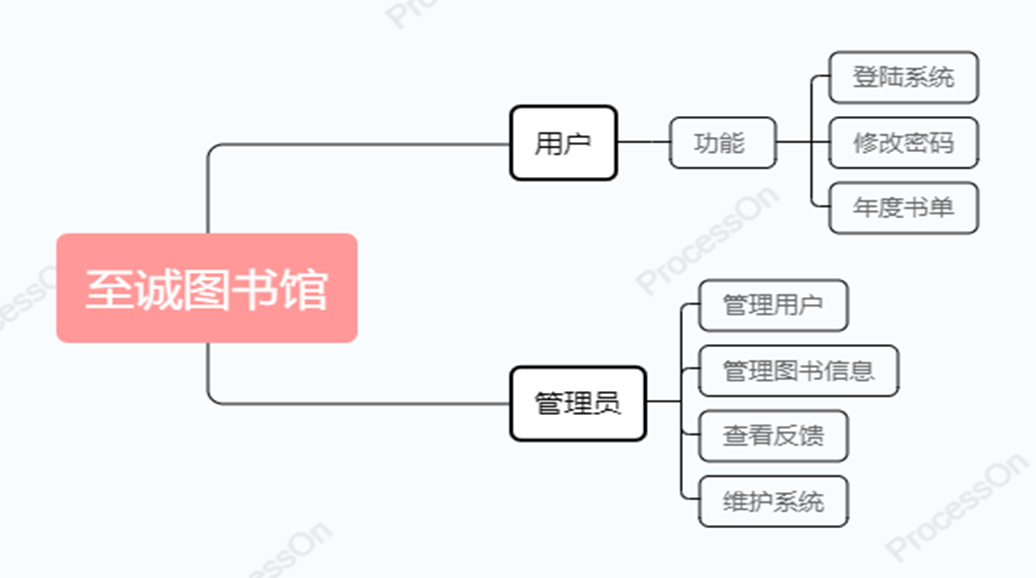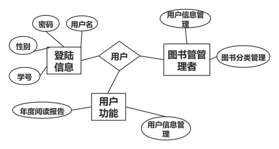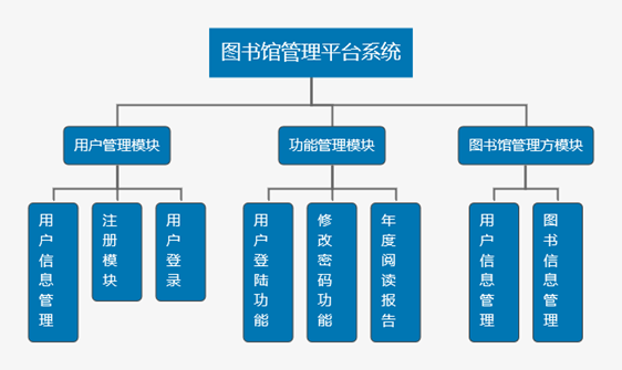 该功能模块图分为三个模块:用户端,功能与管理员端。学生端拥有登录功能以及个人信息管理功能,管理员端拥有用户信息管理功能与图书信息管理功能。。