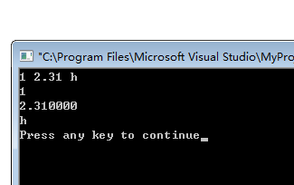 1. 编写程序,使用scanf()函数接收整型、实型、字符型的变量,并分行依次输出。#include<stdio.h>main(){ int a; float b; char c; scanf("%d %f %c",&a,&b,&c); printf("%d\n%f\n%c\n",a,b,c);} |