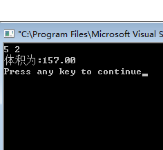 3.编写程序,接收圆柱体底面半径和高,输出其体积(结果保留两位小数)。#include<stdio.h>#define PI 3.14main(){ float h,r,v; scanf("%f %f",&r,&h); v=PI*r*r*h; printf("体积为:%.2f\n",v);} |