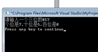4.输入一个三位数,分别输出个位,十位,百位。#include<stdio.h>main(){ int a,ge,shi,bai; printf("请输入一个三位数"); scanf("%d",&a); ge=a%10; shi=a/10%10; bai=a/100; printf("个位是%d,十位是%d,百位是%d\n",ge,shi,bai);} |