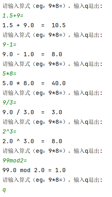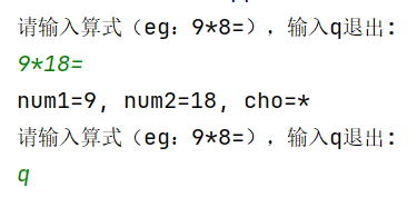 expression=input("请输入算式(eg:9*8=),输入q退出:\n")