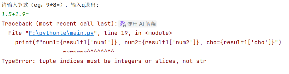 - 问题1解决方案:设置断点进行debug后发现是能正确提取出我要的数和符号,但是在最后一步print出现了问题,当然报错也告诉我了这是什么情况,就是我尝试用字符串索去访问元组元素,然而元组仅支持整数索引或者切片。对比两端代码,发现我在return部分的代码是不同的,而前者我采用的是字典方式返回多个值,而后者我使用的是元组方式,而我在print时一直是采用的字符串索引(像 'num1'、'num2'、'cho' 这样)去访问,因此在第二次时出现了报错。
