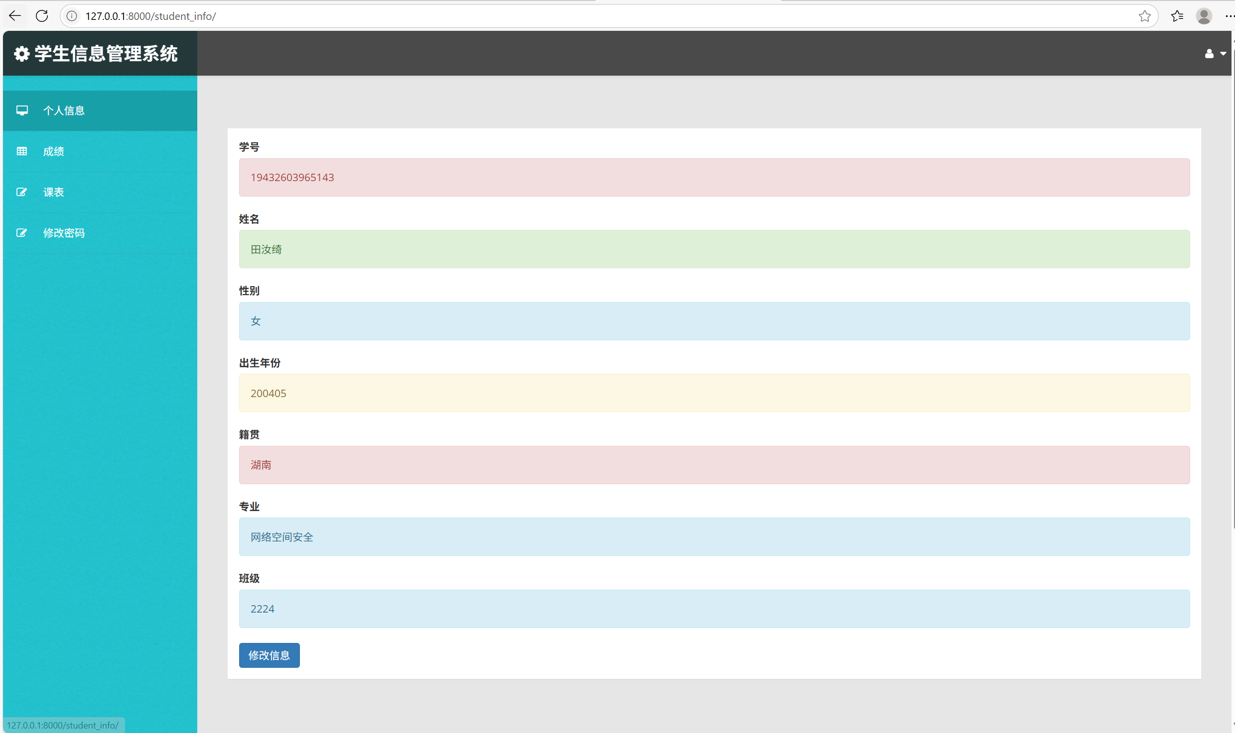 创建一个视图,用来管理学生页面的请求,根据请求中携带的typ参数,判断是哪一个页面(个人信息页,成绩页,课表页面,修改密码页面)