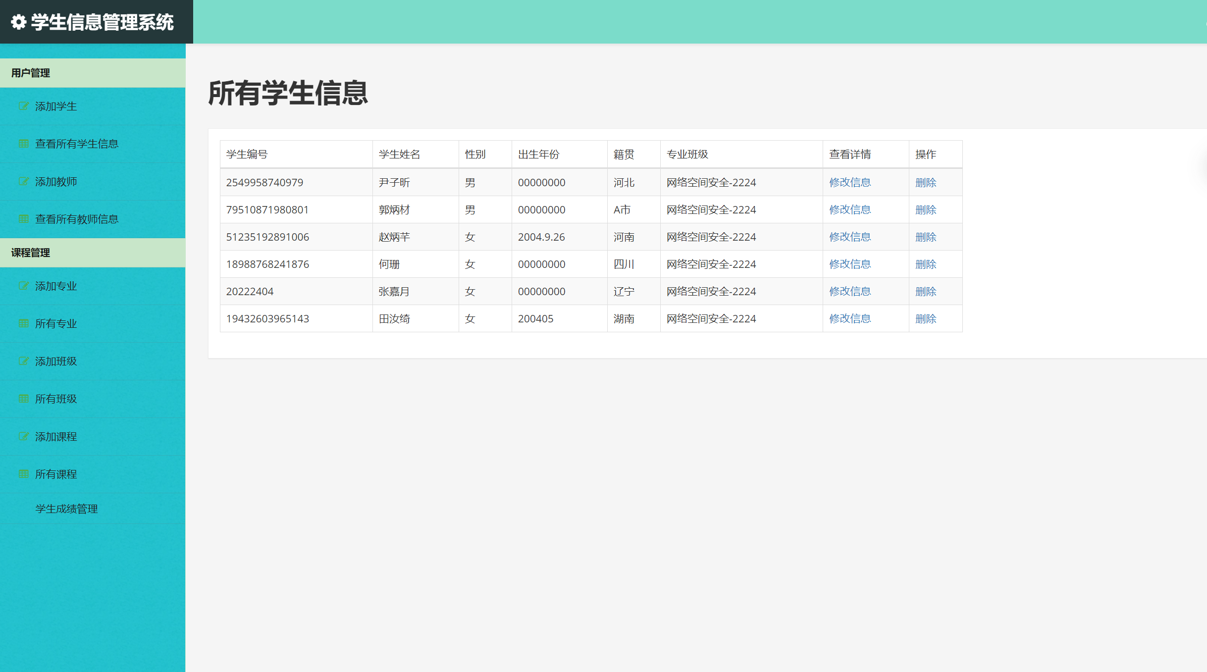 使用管理员账号登录后可进入管理员管理界面,此模块包含用户账号注册、查看、修改、删除功能,学生添加、查看、修改、删除功能,教师添加、查看、修改、删除,专业添加、查看、修改、删除功能,课程添加、查看、修改、删除功能,成绩查看、删除功能。