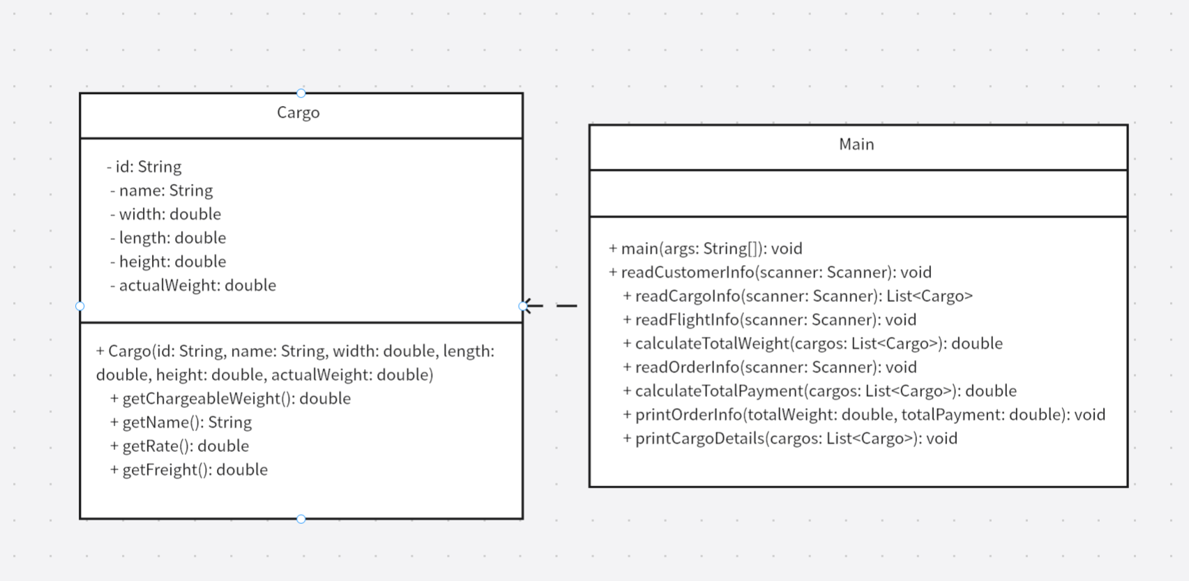 Cargo类同时承担客户、货物、订单的逻辑,违反“单一职责原则”,导致类复杂度高。- 缺乏抽象类设计,所有方法直接在具体类中实现,不利于后续扩展(如新增货物类型需修改