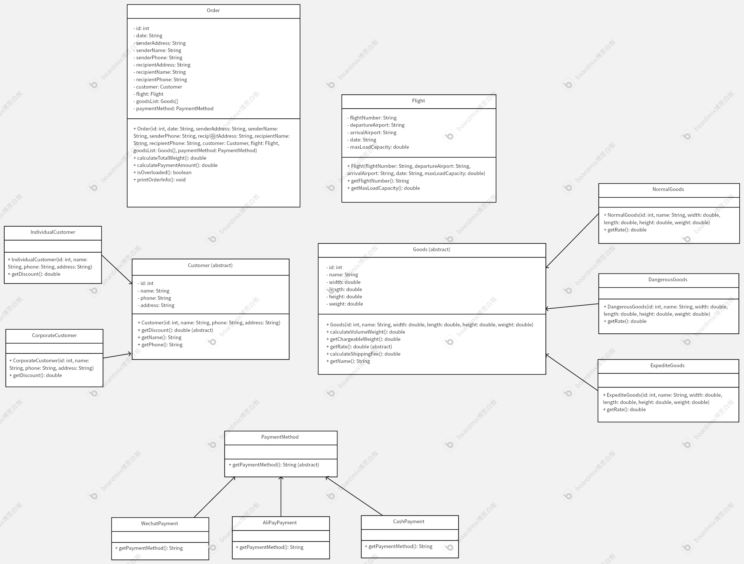 Customer和Goods作为抽象类,强制子类实现关键方法(如getDiscount()、getRate()),确保代码结构的规范性。 - 业务逻辑实现:涉及货物计费重量计算、运费计算、订单信息打印、超载判断等复杂逻辑,需综合运用条件判断、循环结构和方法调用。