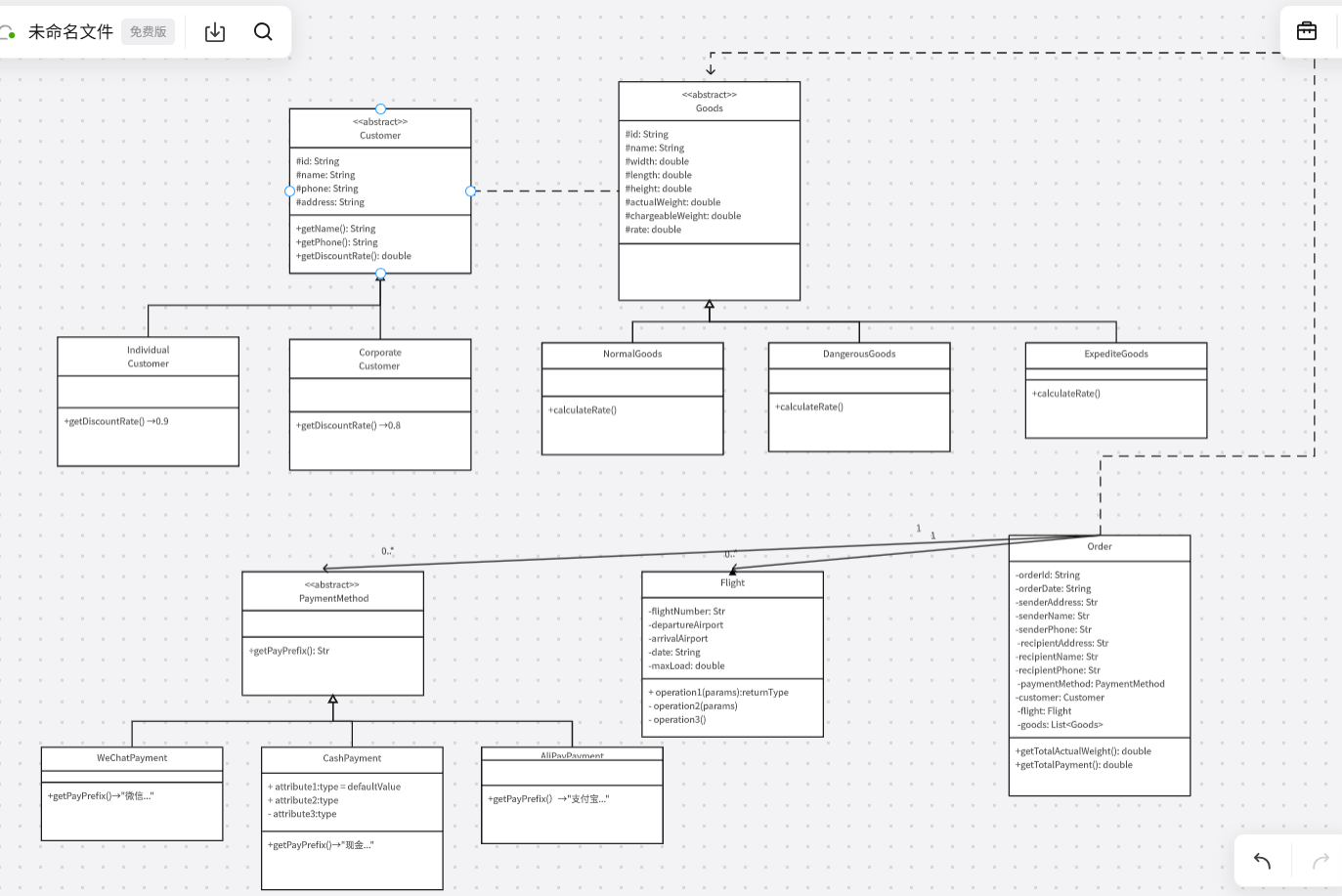 文档中说明 “折扣率针对每个订单的运费”,即总运费 =(各货物计费重量 × 费率)之和 × 折扣率,代码中Order.getTotalPayment()的计算逻辑正确。但需注意:若未来需求改为 “按货物类型分别应用折扣”,当前设计需调整。