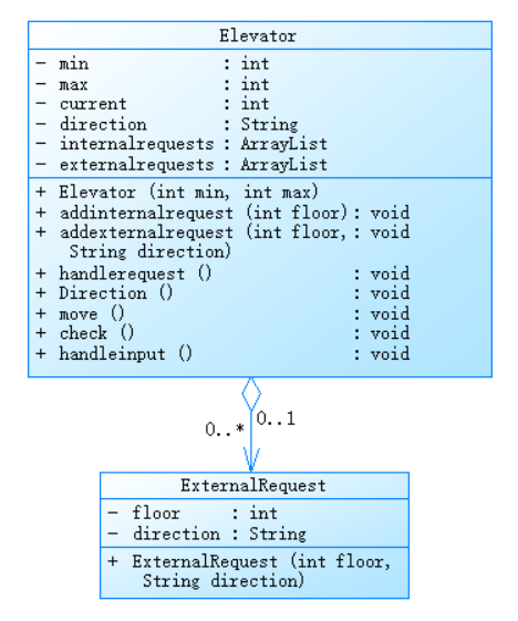 由于这次多加了一个Passenger类,外部请求由之前的<请求楼层数,请求方向>修改为<请求源楼层,请求目的楼层>,就先加了决定外部请求的请求方向,如图