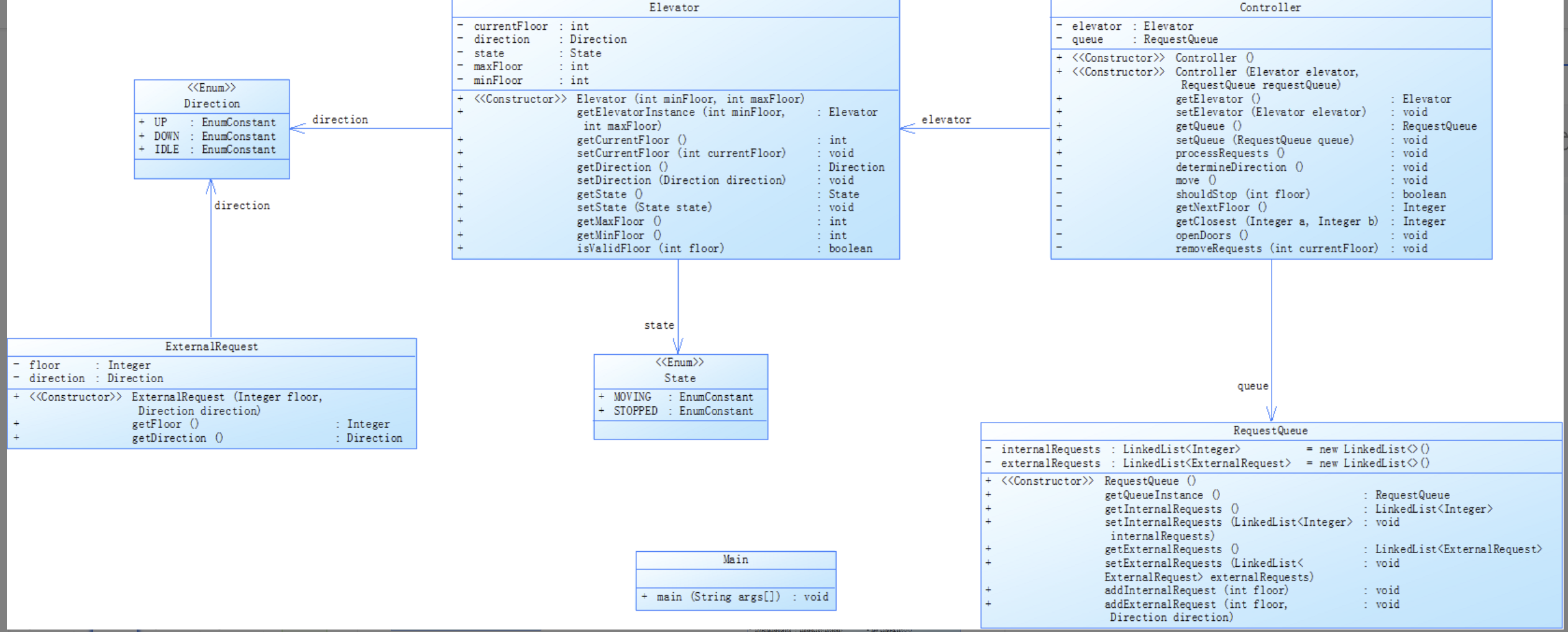 设计一个电梯类,具体包含电梯的最大楼层数、最小楼层数(默认为1层)当前楼层、运行方向、运行状态,以及电梯内部乘客的请求队列和电梯外部楼层乘客的请求队列,其中,电梯外部请求队列需要区分上行和下行。