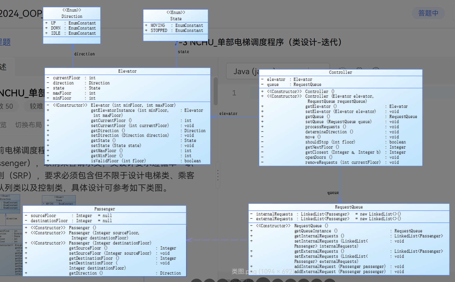 小结:在本次作业中,我延续了上次参照题目类图进行代码设计的思路。通过类图中明确标注的方法名称,如Controller.processRequests()、Elevator.move()等,我尝试梳理每个函数应实现的具体功能,并对各模块的职责进行初步划分。然而,在将这些方法串联起来实现电梯调度的整体逻辑时,却遭遇了瓶颈。由于对类与类之间的交互机制理解不够透彻,在方法调用顺序、参数传递以及状态同步等关键环节上出现偏差,导致程序虽然能够顺利编译并运行,但始终没有任何输出。提交代码后,系统反馈答案错误,这让我意识到看似完整的代码结构背后,仍存在逻辑漏洞。不过,值得欣慰的是,相较于前两次作业,此次代码成功规避了非零返回和编译错误等基础性问题,这也让我看到了自己在代码规范和基础语法掌握上的进步。接下来,我将着重分析方法调用逻辑中的问题,进一步完善程序功能。