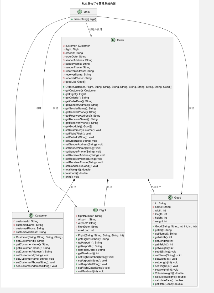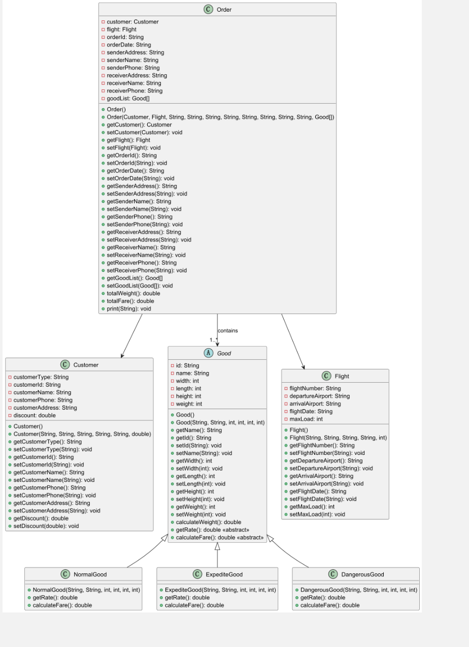 - 健壮性:添加输入校验(如货物尺寸 / 重量非负、机场代码格式),处理无效货物类型和支付方式,避免空指针和非法数据。
