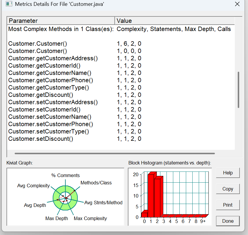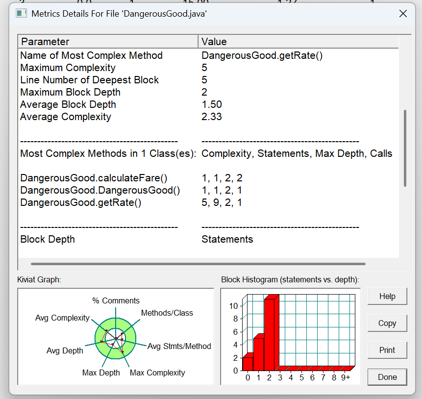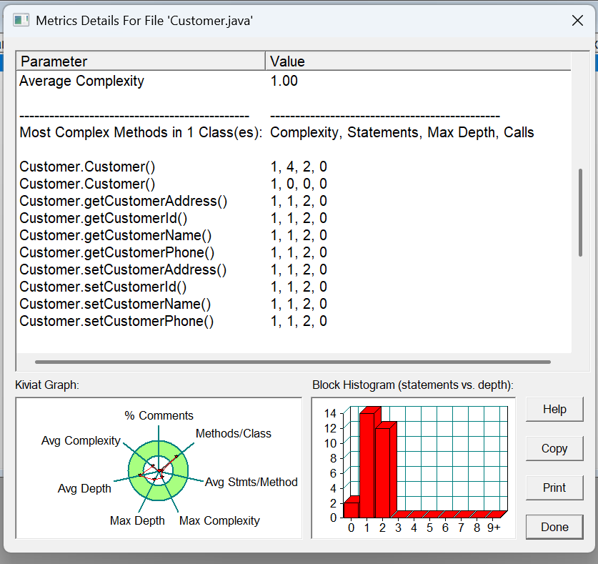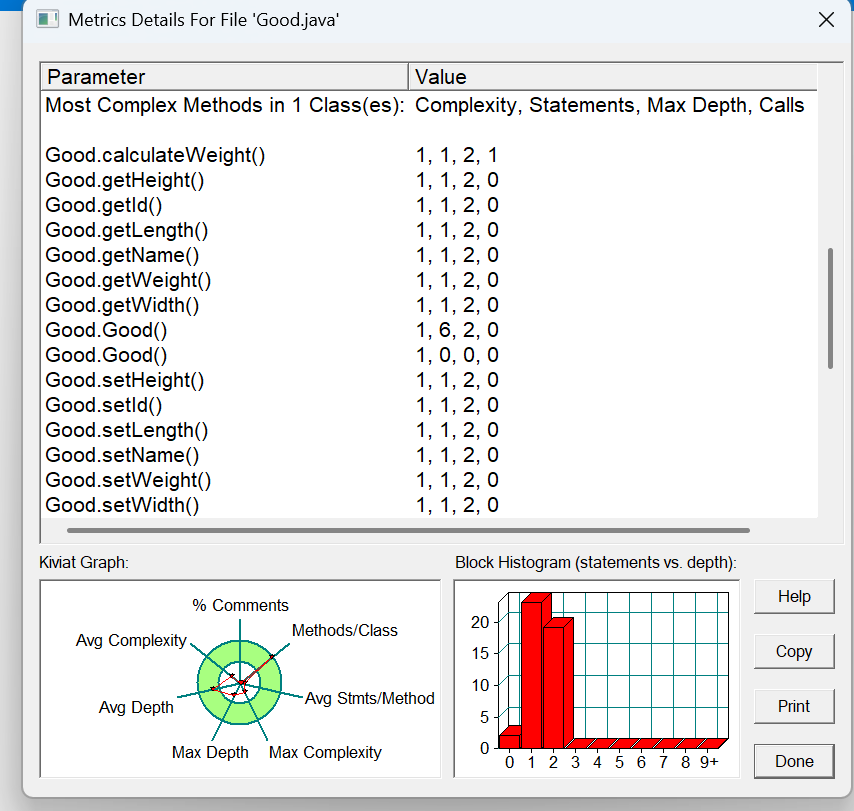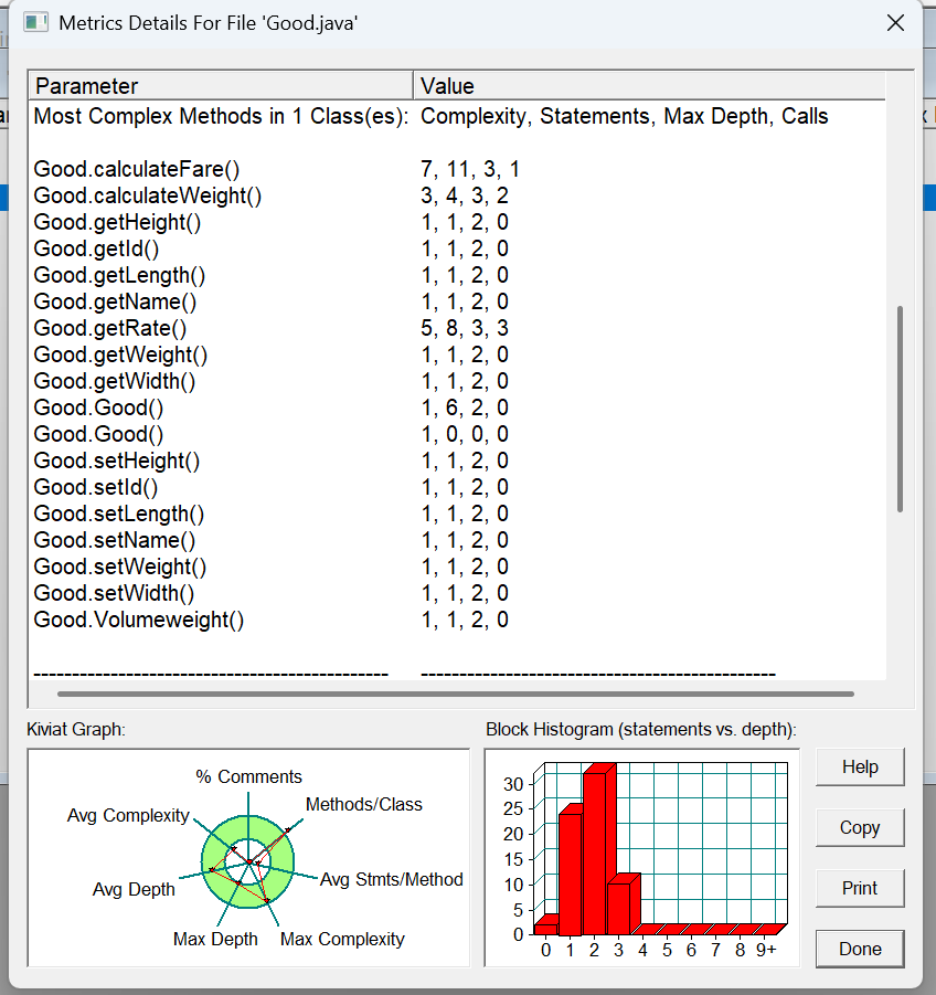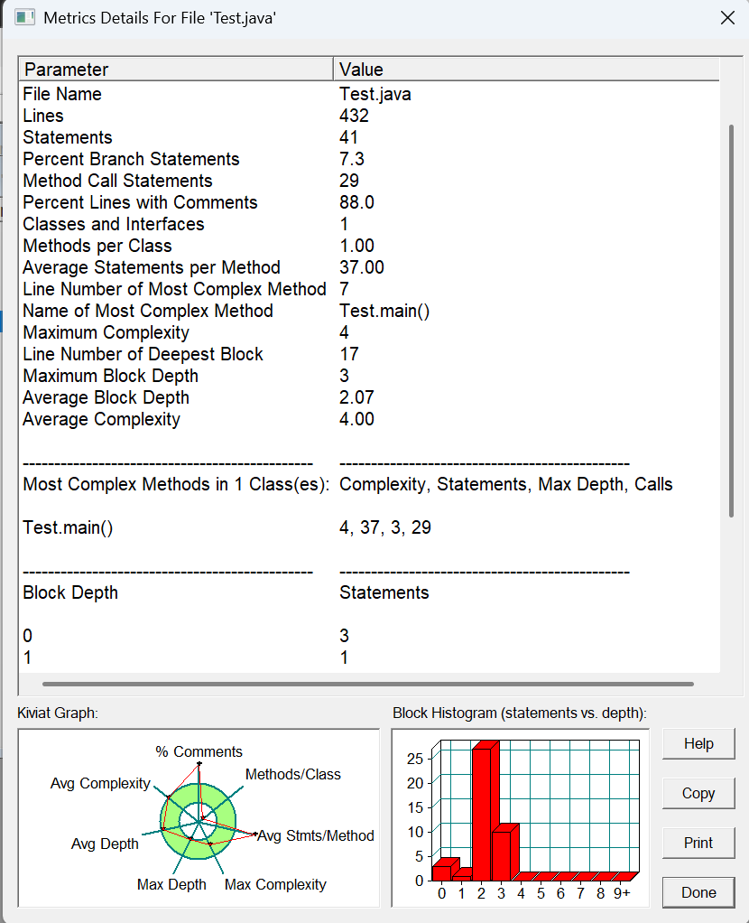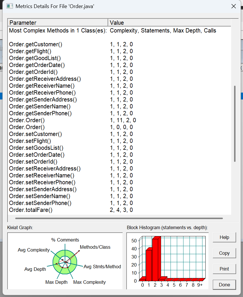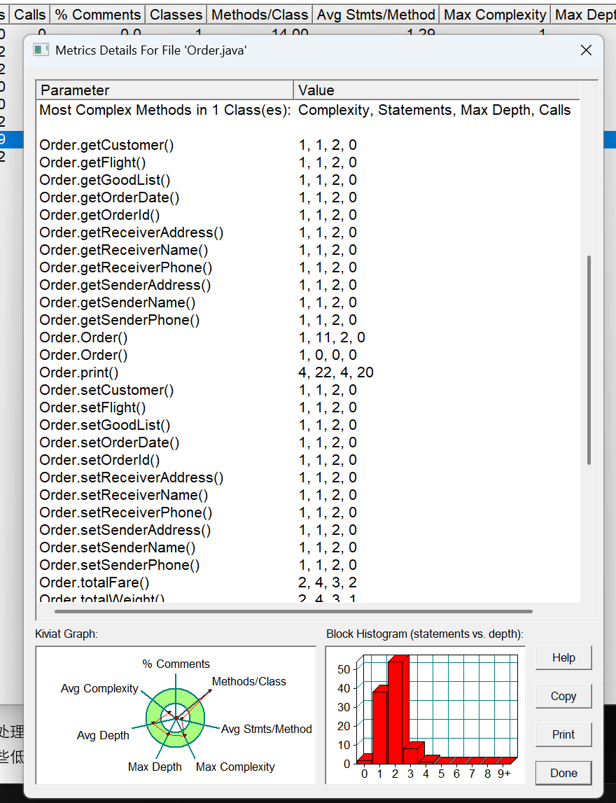 方法的复杂度分析主要基于循环复杂度(v (G)),它可理解为穷尽程序流程每一条路径所需要的试验次数。Essentail Complexity(ev (G))表示一个方法的结构化程度,范围在 [1, v (G)] 之间,值越大程序结构越 “病态”。Design Complexity(iv (G))表示一个方法和它所调用的其他方法的紧密程度,范围也在 [1, v (G)] 之间,值越大联系越紧密。对于类,有 OCavg(类的方法的平均循环复杂度)和 WMC(类的总循环复杂度)两个项目。