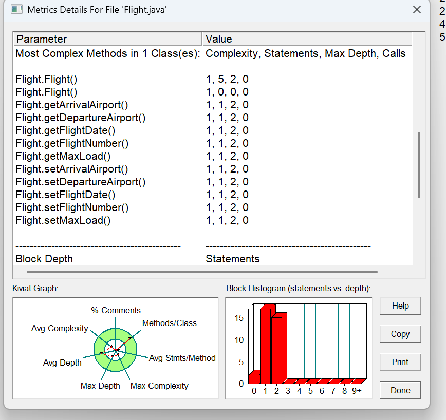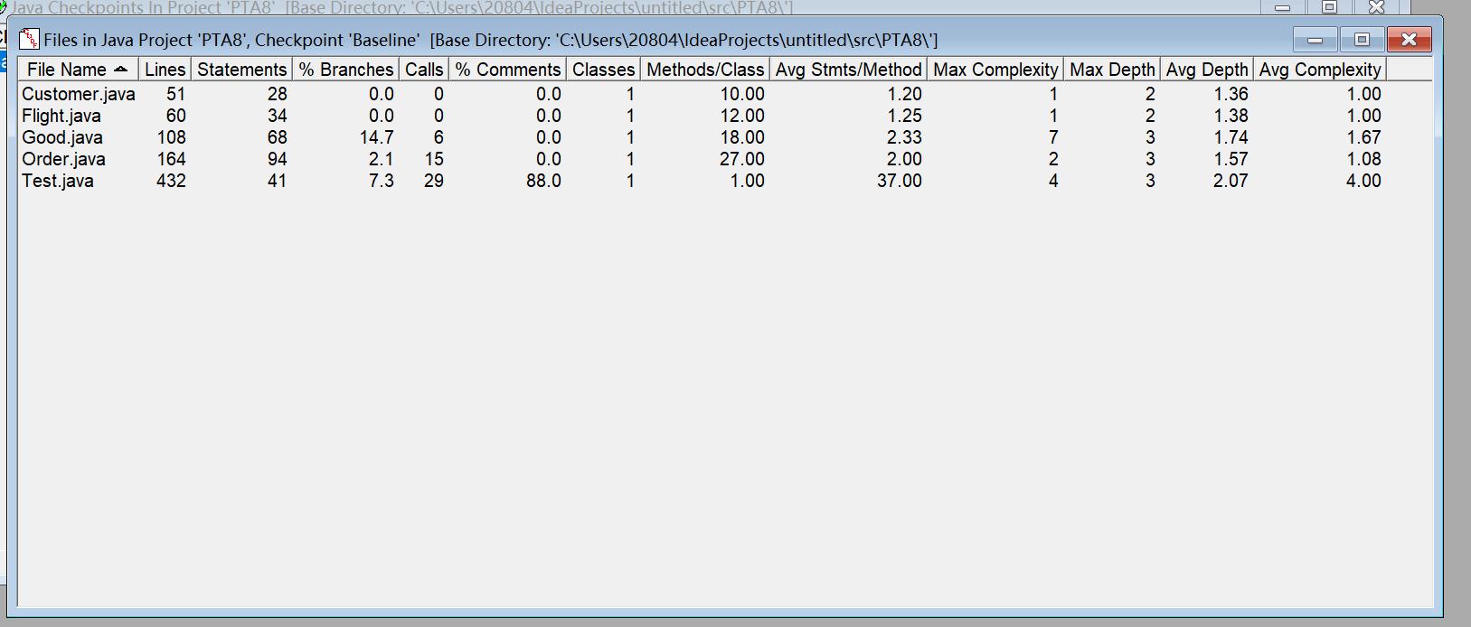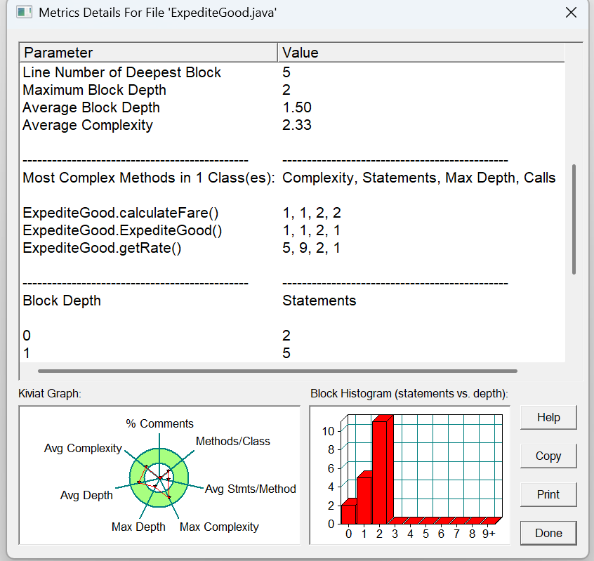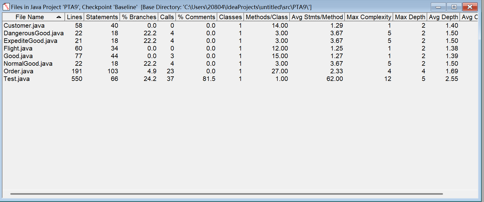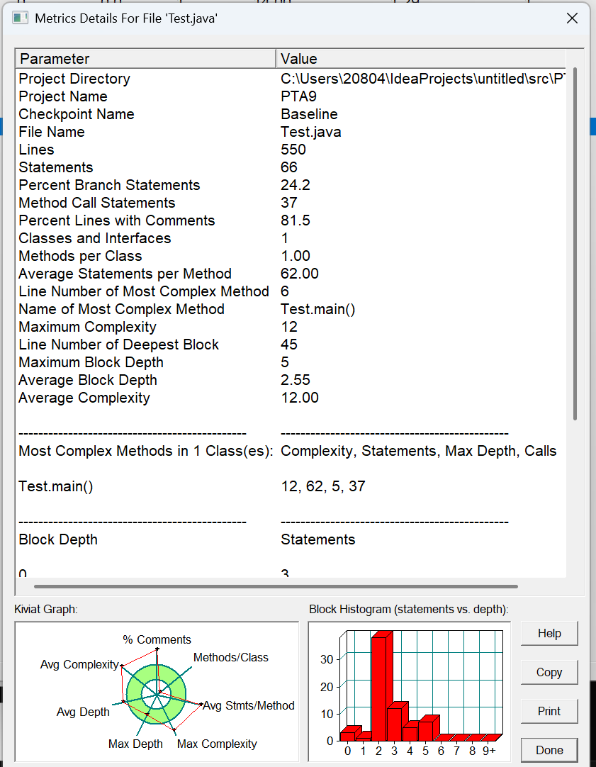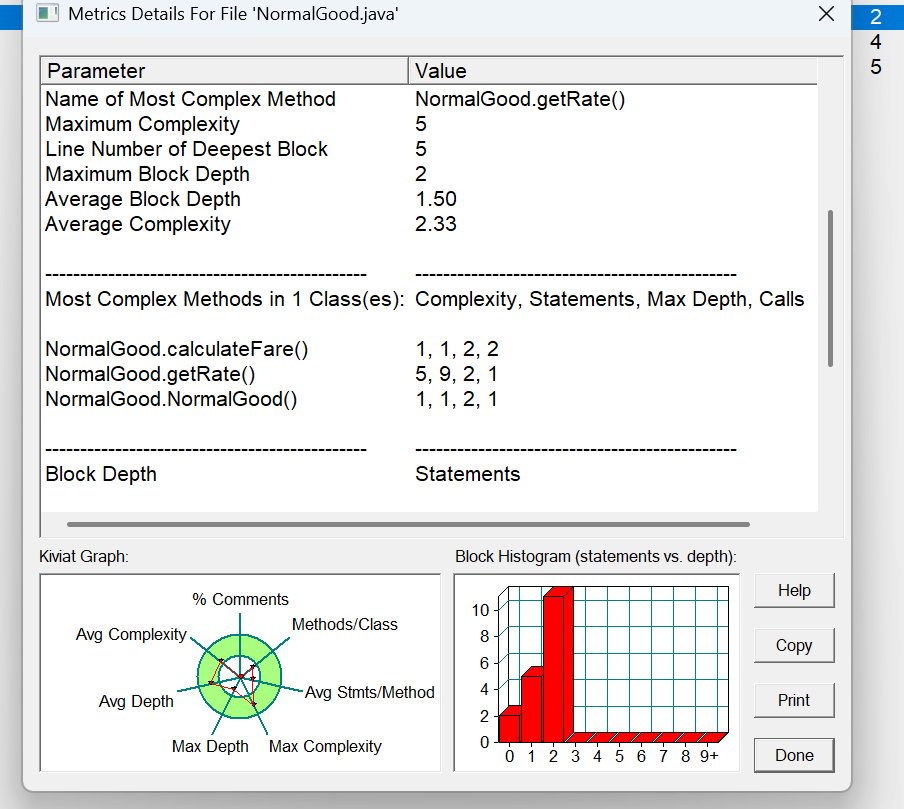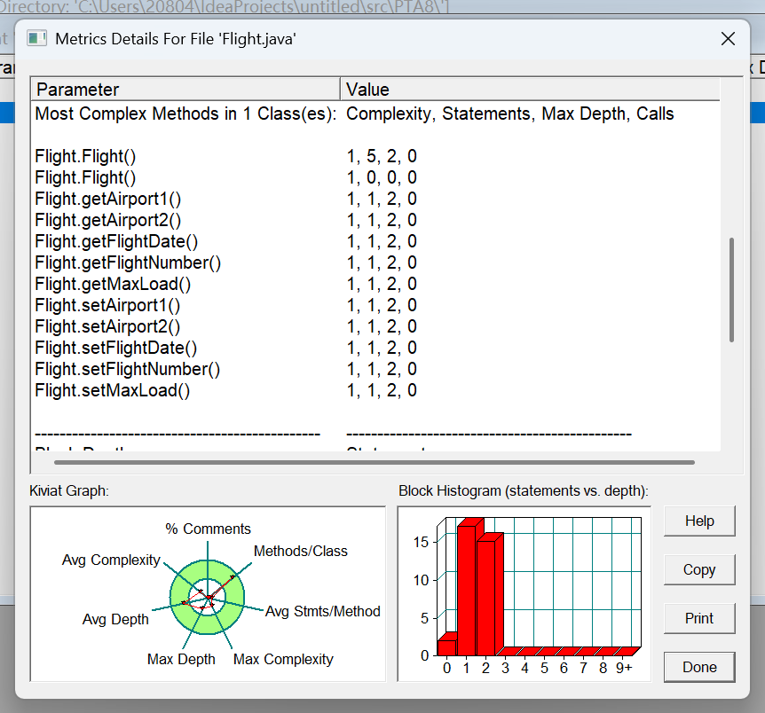 方法的复杂度分析主要基于循环复杂度(v (G)),它可理解为穷尽程序流程每一条路径所需要的试验次数。Essentail Complexity(ev (G))表示一个方法的结构化程度,范围在 [1, v (G)] 之间,值越大程序结构越 “病态”。Design Complexity(iv (G))表示一个方法和它所调用的其他方法的紧密程度,范围也在 [1, v (G)] 之间,值越大联系越紧密。对于类,有 OCavg(类的方法的平均循环复杂度)和 WMC(类的总循环复杂度)两个项目。