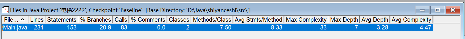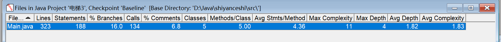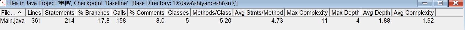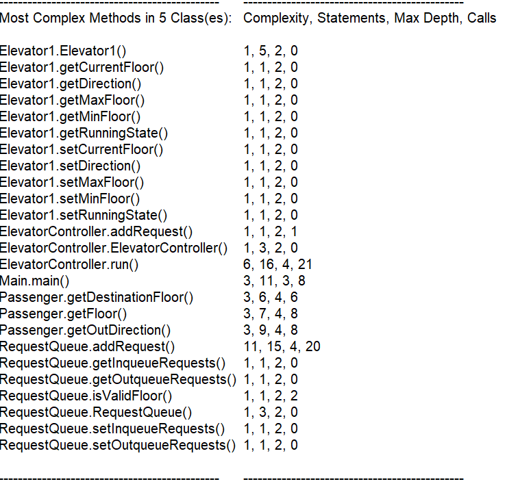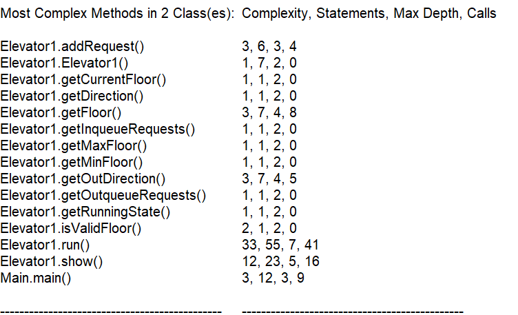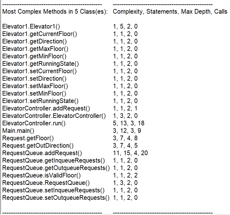 我的Elevator1.run()复杂度高达 33,语句数 55,最大深度 7,调用次数 41 。这是我的电梯运行的核心方法,包含了电梯的调度算法、状态转换等逻辑。