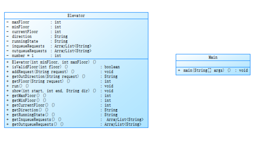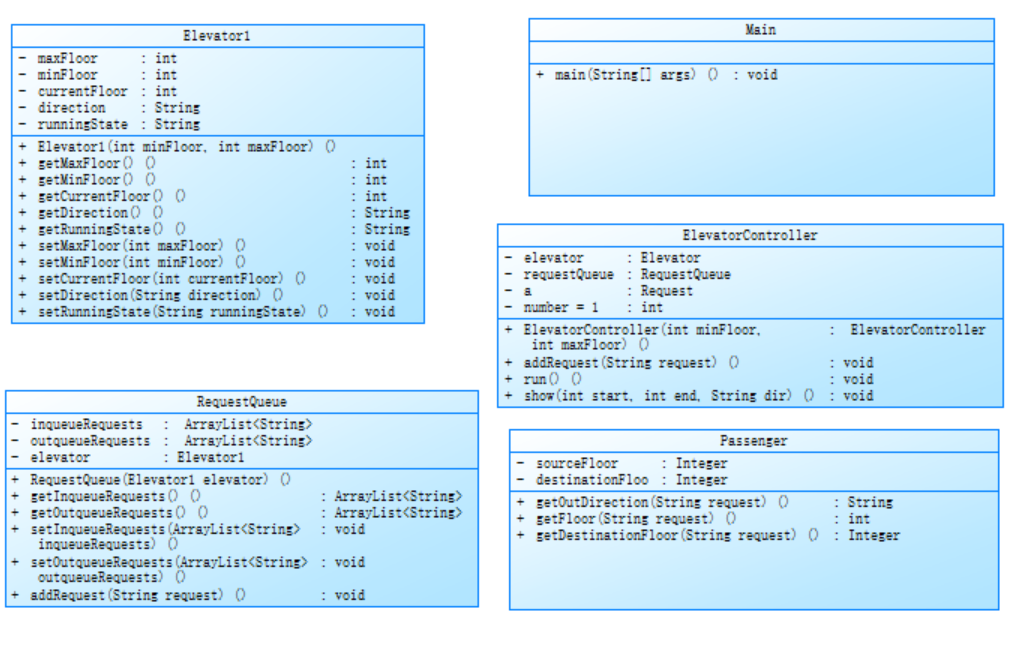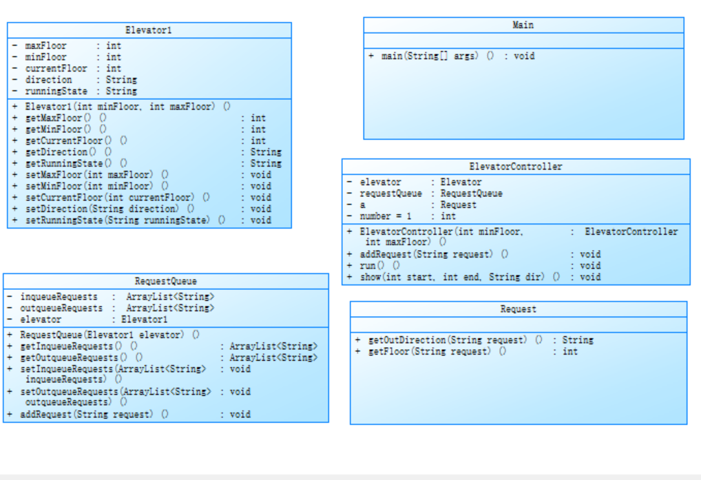 属性:有 inqueueRequests(内部请求队列)和 outqueueRequests(外部请求队列)两个 ArrayList 类型的属性,以及一个 Elevator1 类型的引用 elevator。