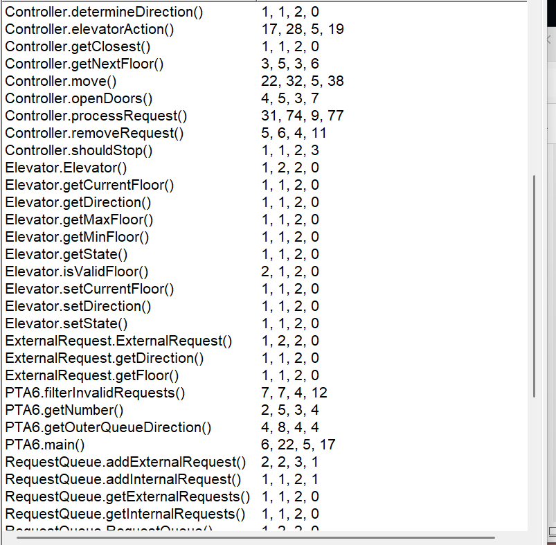 PTA6 类:程序的入口点,读取最小楼层、最大楼层和请求列表。创建 Elevator、RequestQueue 和 Controller 对象,过滤无效请求,将请求添加到请求队列中,最后调用 Controller 的 processRequest 方法处理请求。