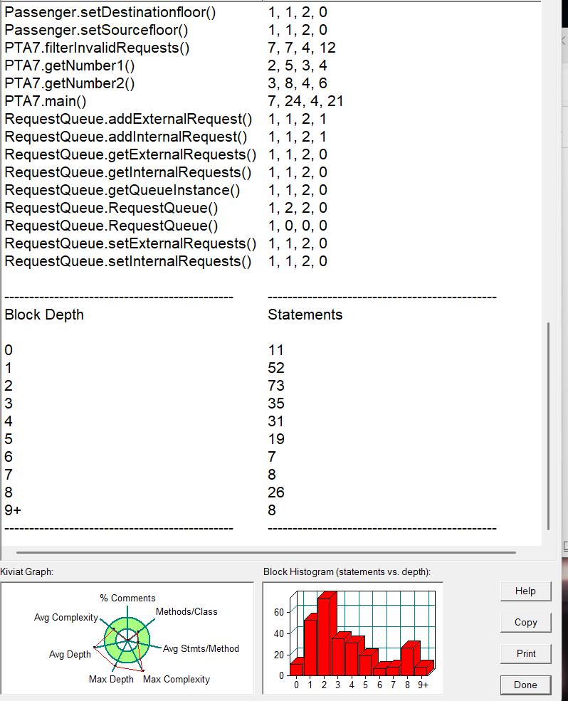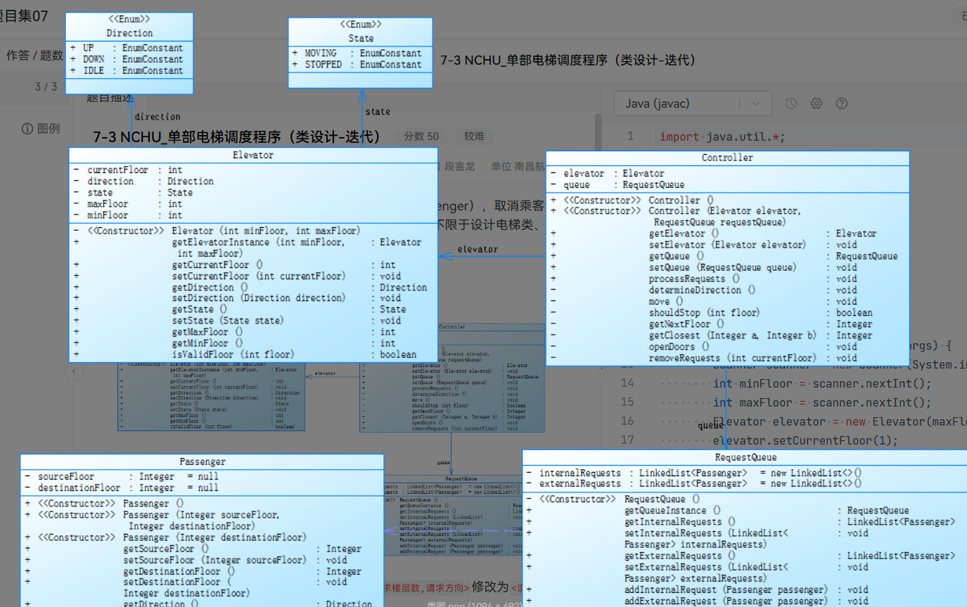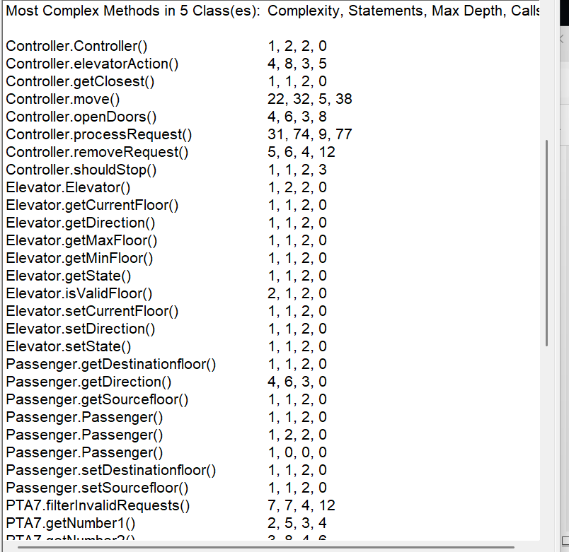 PTA7 类:程序的入口点,读取最小楼层、最大楼层和请求列表。创建 Elevator、RequestQueue 和 Controller 对象,过滤无效请求,将请求添加到请求队列中,最后调用 Controller 的 processRequest 方法处理请求。