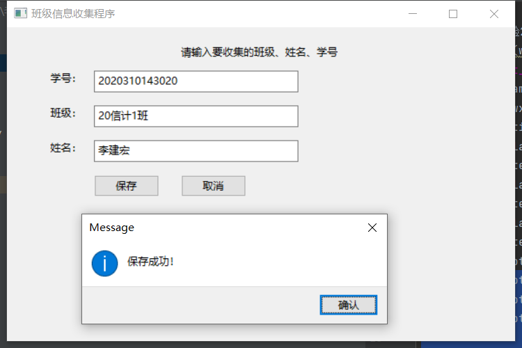 import wx from python实验2 import classinformation class MyFrame(wx.Frame): def __init__(self,parent,id): wx.Frame.__init__(self,parent,id,title="班级信息收集程序",size=(600,400)) pl = wx.Panel(self) self.title = wx.StaticText(pl,label="请输入要收集的班级、姓名、学号",pos=(200,20)) self.label_id = wx.StaticText(pl,label="学号:",pos=(50,50)) self.text_id = wx.TextCtrl(pl,pos=(100,50),size=(235,25),style=wx.TE_LEFT) self.label_bj = wx.StaticText(pl,label="班级:",pos=(50,90)) self.text_bj = wx.TextCtrl(pl, pos=(100, 90), size=(235, 25), style=wx.TE_LEFT) self.label_xm = wx.StaticText(pl, label="姓名:", pos=(50, 130)) self.text_xm = wx.TextCtrl(pl, pos=(100, 130), size=(235, 25), style=wx.TE_LEFT) self.bt_bc = wx.Button(pl,label="保存",pos=(100,170)) self.bt_bc.Bind(wx.EVT_BUTTON,self.Baochun) self.bt_qx = wx.Button(pl,label="取消",pos=(200,170)) self.bt_qx.Bind(wx.EVT_BUTTON, self.Cancel) def Baochun(self,event): id = self.text_id.GetValue() bj = self.text_bj.GetValue() xm = self.text_xm.GetValue() if id =='' or bj == '' or xm == '': message = '输入为空!' else: classinformation.baochuninformation(id,bj,xm) message = '保存成功!' wx.MessageBox(message) def Cancel(self,event): self.text_xm.SetValue('') self.text_bj.SetValue('') self.text_id.SetValue('') wx.MessageBox('取消成功!') if __name__ == '__main__': app = wx.App() frame = MyFrame(parent=None,id=-1) frame.Show() app.MainLoop()