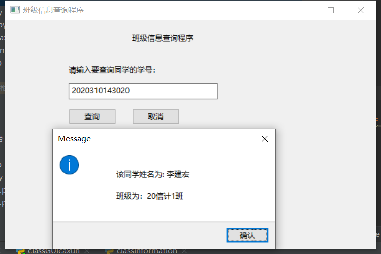 import wx from python实验2 import classinformation class MyFrame(wx.Frame): def __init__(self,parent,id): wx.Frame.__init__(self,parent,id,title="班级信息查询程序",size=(600,400)) pl = wx.Panel(self) self.title = wx.StaticText(pl, label="班级信息查询程序", pos=(200, 20)) self.label_id = wx.StaticText(pl, label="请输入要查询同学的学号:", pos=(100, 70)) self.text_id = wx.TextCtrl(pl, pos=(100, 100), size=(235, 25), style=wx.TE_LEFT) self.bt_bc = wx.Button(pl, label="查询", pos=(100, 140)) self.bt_bc.Bind(wx.EVT_BUTTON, self.Chaxun) self.bt_qx = wx.Button(pl, label="取消", pos=(200, 140)) self.bt_qx.Bind(wx.EVT_BUTTON, self.Cancel) def Chaxun(self,event): id = self.text_id.GetValue() if id =='': message = '输入为空!' else: (a,b,c) = classinformation.chaxuninformation(id) message = """ 该同学姓名为: {:s} 班级为:{:s} """.format(c,b) wx.MessageBox(message) pass def Cancel(self, event): self.text_id.SetValue('') wx.MessageBox('取消成功!') if __name__ == '__main__': app = wx.App() frame = MyFrame(parent=None,id=-1) frame.Show() app.MainLoop()