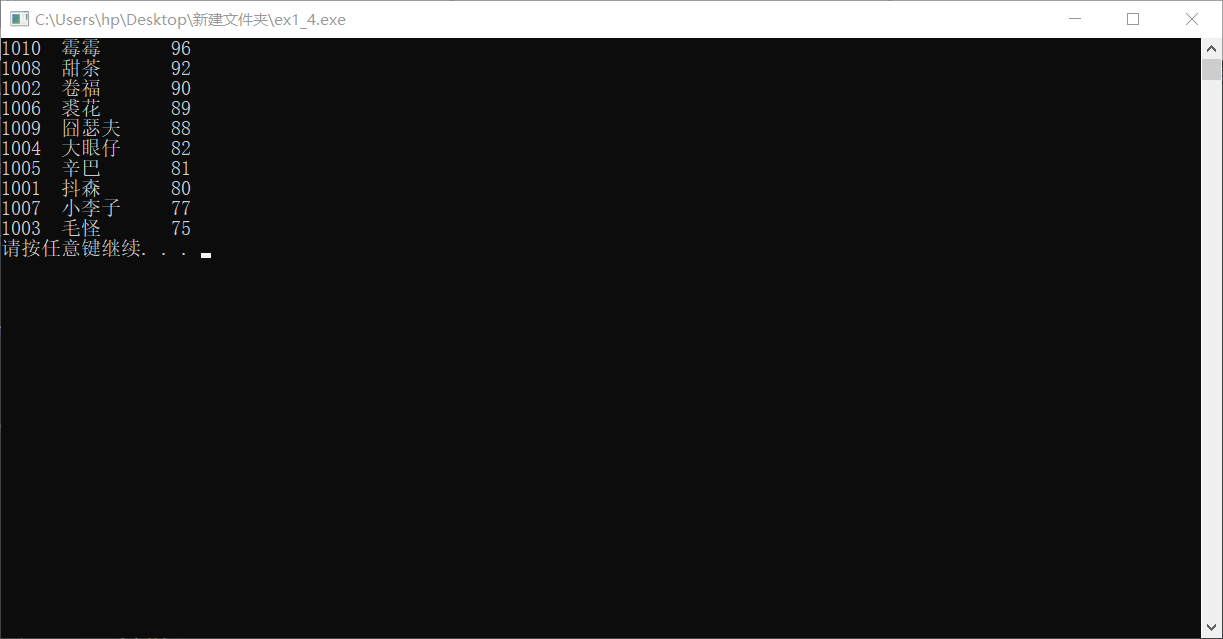 // 从文本数据文件file1.dat中读入数据,按成绩从高到低排序,并将排序结果输出到屏幕上,同时,也以二进制方式存入文件file4.dat中。 #include <stdio.h> #include <stdlib.h> #define N 10 // 定义一个结构体类型STU typedef struct student { int num; char name[20]; int score; }STU; void sort(STU *pst, int n); // 函数声明 int main() { FILE *fin, *fout; STU st[N]; int i; // 以只读文本方式打开文件file1.dat fin = fopen("file4.dat", "rb"); if( !fin ) { // 如果打开失败,则输出错误提示信息,然后退出程序 printf("fail to open file1.dat\n"); exit(0); } // 从fin指向的数据文件file1.dat中读取数据到结构体数组st for(i=0; i<N; i++) fscanf(fin, "%d %s %d", &st[i].num, st[i].name, &st[i].score); fclose(fin); // 关闭fin指向的文件file1.dat // 调用函数sort()对数组st中数据,按分数由高到低排序 sort(st, N); // 以写方式打开/创建二进制文件file4.dat fout = fopen("file5.dat", "wb"); if( !fout ) { // 如果打开失败,则输出错误提示信息,然后退出程序 printf("fail to open file1.dat\n"); exit(0); } // 将排序后的数组st中数据输出到屏幕 for(i=0; i<N; i++) printf("%-6d%-10s%3d\n", st[i].num, st[i].name, st[i].score); // 将排序后的数组st中数据写到二进制文件file4.dat fwrite(st, sizeof(STU), N, fout); // 将从地址st开始的sizeof(STU)×N个字节信息写入fout指向的文件file4.dat中 fclose(fout); // 关闭fout指向的文件file4.dat system("pause"); return 0; } // 函数功能描述:对pst指向的n个STU结构体数据进行排序,按成绩数据项由高到底排序 // 排序算法:冒泡法 void sort(STU *pst, int n) { STU *pi, *pj, t; for(pi = pst; pi < pst+n-1; pi++) for(pj = pi+1; pj < pst+n; pj++) if(pi->score < pj->score) { t = *pi; *pi = *pj; *pj = t; } }