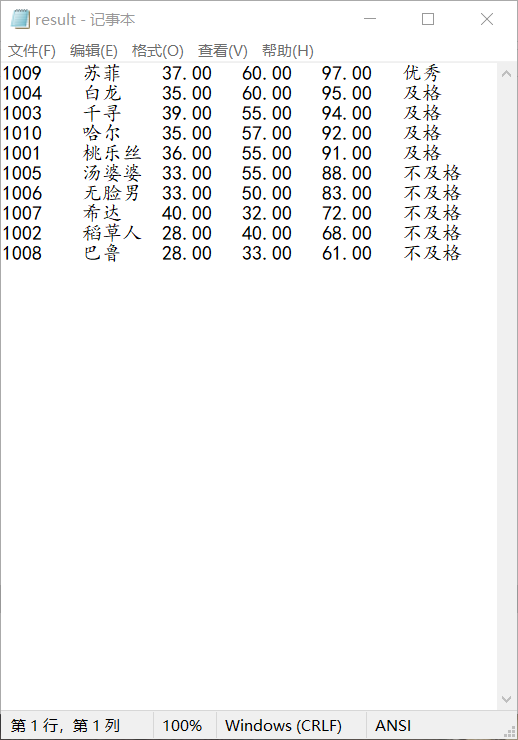 // 从文本文件file1.dat中读取数据,找出最高分和最低分学生信息,并输出在屏幕上 #include <stdio.h> #include <stdlib.h> #define N 10 // 定义一个结构体类型STU typedef struct student { int num; char name[20]; int score; }STU; int main() { STU st, stmax, stmin; int i; FILE *fp; // 以只读文本方式打开文件file1.dat fp = fopen("file1.dat", "r"); if( !fp ) { // 如果打开失败,则输出错误提示信息,然后退出程序 printf("fail to open file1.dat\n"); exit(0); } stmax.score = 0; // 先假定最高分是0,后面如发现比当前最高分还高的分数,就更新最高分 stmin.score = 100; // 先假定最低分是100分,后面如发现比当前最低分更低的分数,就更新最低分 while(!feof(fp)) { fscanf(fp, "%d %s %d", &st.num, st.name, &st.score); // 从fp指定的文件中格式化读取一个学生信息 if(st.score > stmax.score) stmax = st; else if(st.score < stmin.score) stmin = st; } fclose(fp); printf("最高分学生信息: %5d%15s%5d\n", stmax.num, stmax.name, stmax.score); printf("最低分学生信息: %5d%15s%5d\n", stmin.num, stmin.name, stmin.score); system("pause"); return 0; } // 这是《C语言程序设计教程学习指导》「2.10 文件」中的实验,细微处做了微调 // 这个源代码没有考虑多个高分或多个低分的情形。