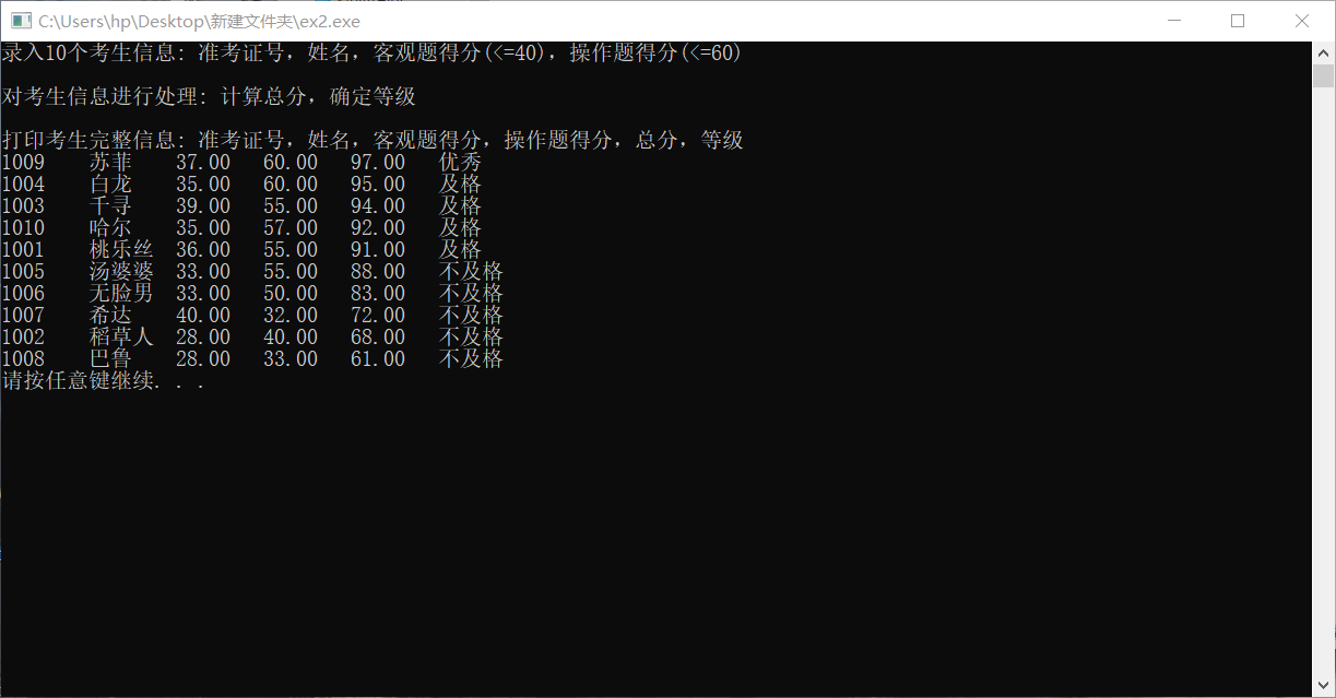#include <stdio.h> #include <stdlib.h> #include <string.h> const int N = 10; // 定义结构体类型struct student,并定义其别名为STU typedef struct student { long int id; char name[20]; float objective; /*客观题得分*/ float subjective; /*操作题得分*/ float sum; char level[10]; }STU; // 函数声明 void input(STU s[], int n); void output(STU s[], int n); void process(STU s[], int n); int main() { STU stu[N]; printf("录入%d个考生信息: 准考证号,姓名,客观题得分(<=40),操作题得分(<=60)\n", N); input(stu, N); printf("\n对考生信息进行处理: 计算总分,确定等级\n"); process(stu, N); printf("\n打印考生完整信息: 准考证号,姓名,客观题得分,操作题得分,总分,等级\n"); output(stu, N); system("pause"); return 0; } // 从文本文件examinee.txt读入考生信息:准考证号,姓名,客观题得分,操作题得分 void input(STU s[], int n) { // 补足代码 // ××× FILE*fp; int i; fp=fopen("examinee.txt","r"); if(fp==NULL) { printf("error"); exit(0); } for(i=0;i<n;i++) { fscanf(fp,"%d%s%f%f",&s[i].id,s[i].name,&s[i].objective,&s[i].subjective); } fclose(fp); } // 输出考生完整信息: 准考证号,姓名,客观题得分,操作题得分,总分,等级 // 不仅输出到屏幕上,还写到文本文件result.txt中 void output(STU s[], int n) { // 补足代码 // ××× FILE*fp; int i; fp=fopen("result.txt","w"); if(fp==NULL) { printf("error"); exit(0); } for(i=0;i<n;i++) { fprintf(fp,"%d\t%s\t%.2f\t%.2f\t%.2f\t%s\t\n",s[i].id,s[i].name,s[i].objective,s[i].subjective,s[i].sum,s[i].level); printf("%d\t%s\t%.2f\t%.2f\t%.2f\t%s\t\n",s[i].id,s[i].name,s[i].objective,s[i].subjective,s[i].sum,s[i].level); } fclose(fp); } // 对考生信息进行处理:计算总分,排序,确定等级 void process(STU s[], int n) { // 补足代码 // ××× int i,j,k,m; student temp; for(i=0;i<n;i++) { s[i].sum=(s[i].objective+s[i].subjective); } for(j=0;j<n-1;j++) for(k=0;k<n-1-j;k++) if(s[k].sum<s[k+1].sum) { temp=s[k]; s[k]=s[k+1]; s[k+1]=temp; } for(m=0;m<n;m++) { if(m<=(int)(0.1*n)-1) strcpy(s[m].level,"优秀"); else if((int)(0.1*n-1)<m&&m<=(int)(0.5*n-1)) strcpy(s[m].level,"及格"); else strcpy(s[m].level,"不及格"); } }