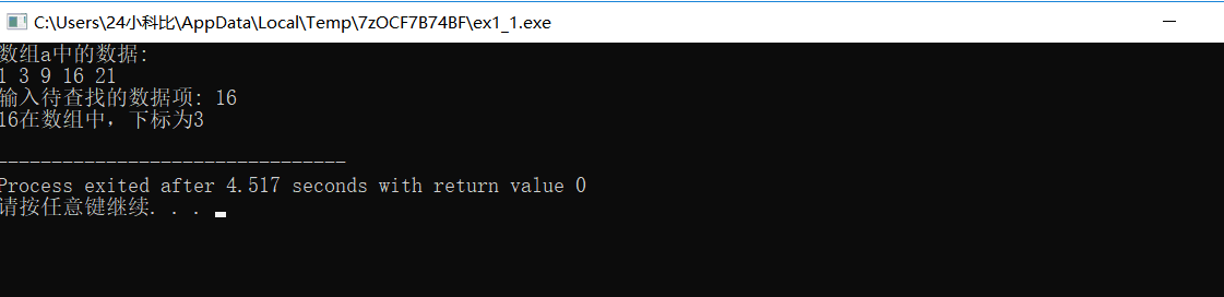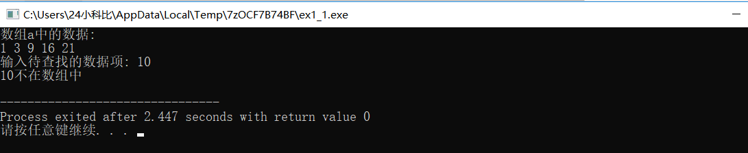 #include <stdio.h> const int N=5; int binarySearch(int *x, int n, int item); int main() { int a[N]={1,3,9,16,21}; int i,index, key; printf("数组a中的数据:\n"); for(i=0;i<N;i++) printf("%d ",a[i]); printf("\n"); printf("输入待查找的数据项: "); scanf("%d", &key); index=binarySearch(a,5,key); // 调用函数binarySearch()在数组a中查找指定数据项item,并返回查找结果 // 补足代码① // ××× if(index>=0) printf("%d在数组中,下标为%d\n", key, index); else printf("%d不在数组中\n", key); return 0; } //函数功能描述: //使用二分查找算法在x指向的数据项开始的n个数据中,查找item // 如果找到,返回其位置 // 如果没找到,返回-1 int binarySearch(int *x, int n, int item) { int low, high, mid; low = 0; high = n-1; while(low <= high) { mid = (low+high)/2; if (item == *(x+mid)) return mid; else if(item<*(x+mid)) high = mid - 1; else low = mid + 1; } return -1; }