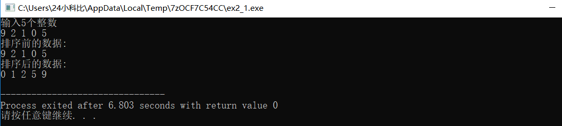 #include <stdio.h> const int N=5; void selectSort(int [], int); // 函数声明(函数声明中可以省略变量名、数组名) void input(int [], int); void output(int [], int); int main() { int a[N]; printf("输入%d个整数\n", N); input(a, N); printf("排序前的数据:\n"); output(a,N); selectSort(a,N); // 调用selectSort()对数组a中的N个元素排序 printf("排序后的数据:\n"); output(a, N); return 0; } // 函数定义 // 函数功能描述:输入n个整数到数组a中 void input(int a[], int n) { int i; for(i=0; i<n; i++) scanf("%d", &a[i]); } // 函数定义 // 函数功能描述:输出数组a中的n个整数 void output(int a[], int n) { int i; for(i=0; i<n; i++) printf("%d ", a[i]); printf("\n"); } // 函数定义 // 函数功能描述:使用选择法对数组a中的n个整数由小到大排序 void selectSort(int a[], int n) { int i, j, k, temp; for(i=0; i<n-1; i++) { k = i; // k用于记录当前最小元素的下标 for(j=i+1; j<n; j++) if (a[j] < a[k]) k = j; // 如果a[j]比当前最小元素还要小,就更新k,确保它总是存放最小元素的下标 if(k != i) { // 找到最小元素后,交换a[i]和a[k] temp = a[i]; a[i] = a[k]; a[k] = temp; } } }