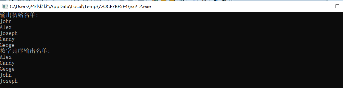#include <stdio.h> #include <string.h> void selectSort(char str[][20], int n ); // 函数声明,形参str是二维数组名 int main() { char name[][20] = {"John", "Alex", "Joseph", "Candy", "Geoge"}; int i; printf("输出初始名单:\n"); for(i=0; i<5; i++) printf("%s\n", name[i]); selectSort(name, 5); // 调用选择法对name数组中的字符串排序 printf("按字典序输出名单:\n"); for(i=0; i<5; i++) printf("%s\n", name[i]); return 0; } // 函数定义 // 函数功能描述:使用选择法对二维数组str中的n个字符串按字典序排序 void selectSort(char str[][20], int n) { // 补足代码 // ××× int i,j,k; char temp[20]; for(i=0;i<n-1;i++) { k=i; for(j=i+1;j<n;j++) if(strcmp(str[j],str[k])<0) k=j; if(k!=i){ strcpy(temp,str[i]); strcpy(str[i],str[k]); strcpy(str[k],temp); }