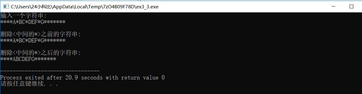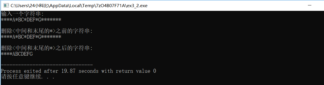 #include <stdio.h> void delStarButPrefix(char []); // 函数声明(函数声明中可以省略数组名不写) int main() { char string[80]; printf("输入一个字符串:\n"); gets(string); printf("\n删除<中间和末尾的*>之前的字符串:\n"); puts(string); delStarButPrefix(string); // 调用函数,删除中间和末尾的*; 注意实参的写法 printf("\n删除<中间和末尾的*>之后的字符串:\n"); puts(string); return 0; } // 函数定义 // 函数功能描述 // 删除字符数组s中除了前导*以外的所有*(即删除字符串中间和末尾出现的*) void delStarButPrefix(char s[]) { int i=0; // i用于记录字符在字符数组s中的下标 char *p = s; // 跳过前导*,i记录字符在字符数组s中的下标,p记录首个非*字符的位置 while(*p && *p == '*') { p++; i++; } // 从p指向的字符开始,把遇到的*删除 while(*p) { if(*p != '*') { s[i] = *p; i++; } p++; } s[i] = '\0'; // 思考:这一步这样写的原因 }