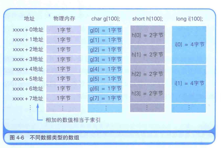 之所以说数组是内存的使用方法的基础,是因为数组和内存的物理构造是一样的。不过,如果只能逐个字节地来读写,程序就会变得比较麻烦,因而可以指定任意数据类型来定义数组。(图4-6).