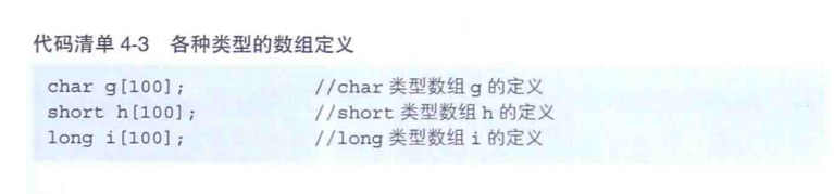 代码点歌单4-3表示的是在C语言中定义char类型、short类型和long类型这三个数组。用括号围起来的[100],表示数组的元素有100个。由于在C语言中,数组的索引是从0开始的,因此charg[100];表示的就是可以使用g[0]~g[99]这100个元素。