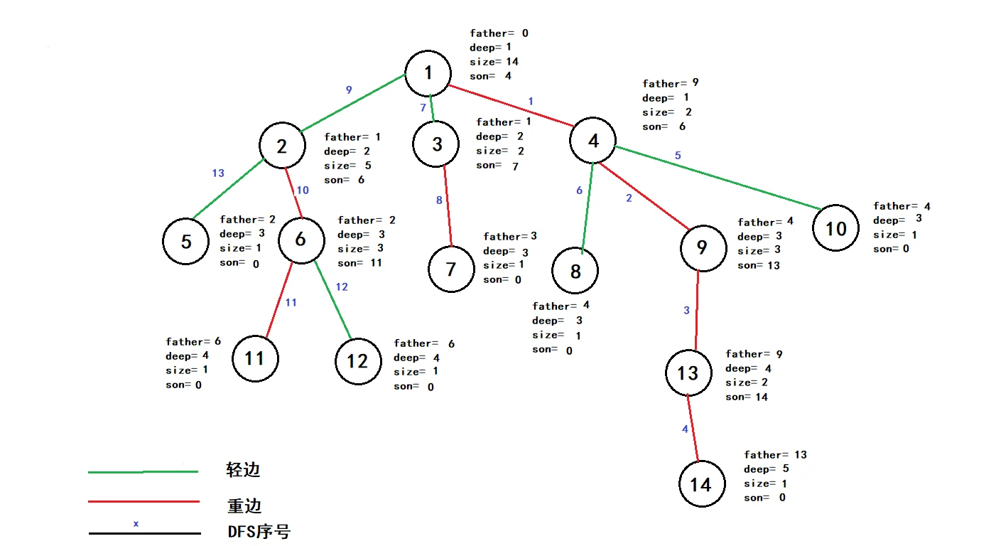 - 对于一个点先找到他的子树大小和他的重儿子(size数组和son数组)