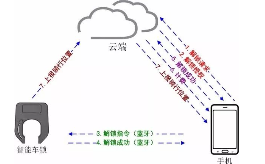 ①. 手机先扫单车上二维码,而后向云端发起解锁请求(请求中会携带扫码单车的ID信息及用户个人账号信息)。云端对用户信息、单车信息进行核查,而后将授权信息发送给手机。(步骤1、2)