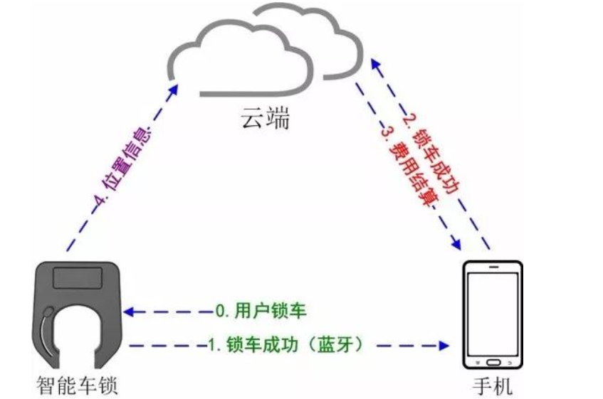 共享单车应用,其实就是通过“单车-云端-用户手机”之间的信息传递来完成的,其中最关键的是解闭智能锁的过程。目前,最新的“GPS定位+蓝牙”解锁和还车模式已经比较普遍。