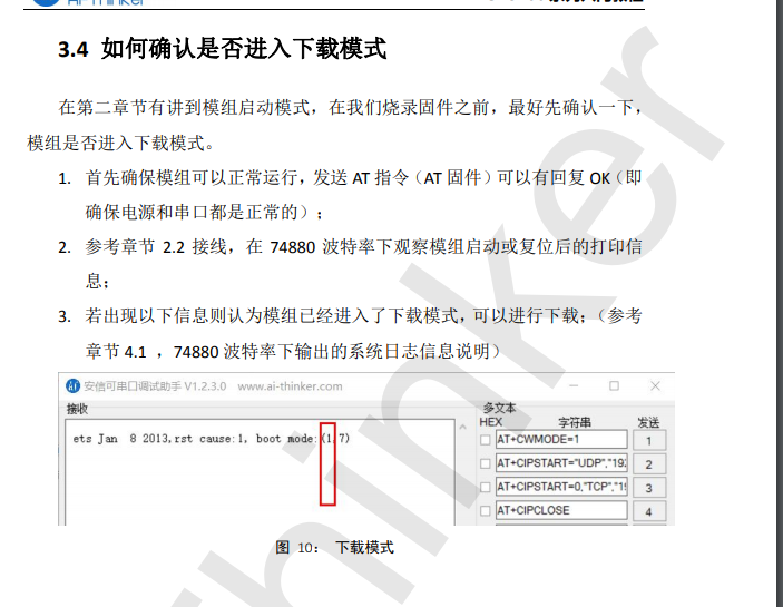 连线VCC RX TX GND 和 IO0(接到GND可以下载进入模式)下图(1,7)中1表示进入下载 3