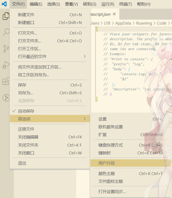 在VScode中点击左上角文件 → 首选项 → 用户片段 → 在搜索框中搜索 JavaScript 选择 JavaScript.json