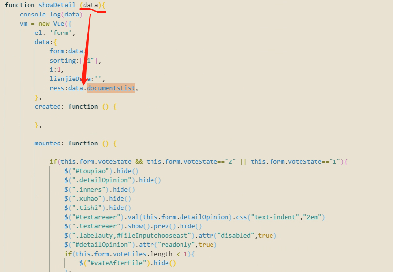 通过showDetail里的data 直接在ress写:data.documentsList 因为showDetail的数据传过来然后再data里直接用,再赋值ress