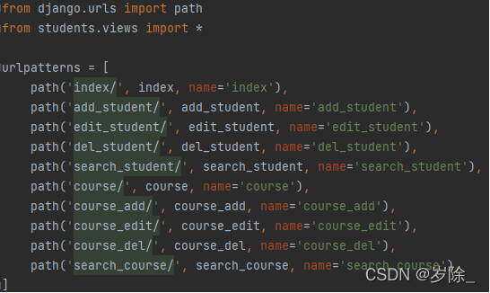 在django中所有的路由最终都被保存到一个变量urlpatterns,urlpatterns必须声明在主应用下的urls.py总路由中,这些配置是由settings设置的。