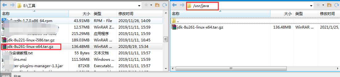 四、下载完毕后,在linux的根目录/usr文件夹下,新建一个java文件夹,把jdk上传到java文件夹下。输入命令 [root@localhost ~]# mkdir /usr/java 然后在xftp界面,右键点击安装包,传输到 /usr/java/ 文件夹。