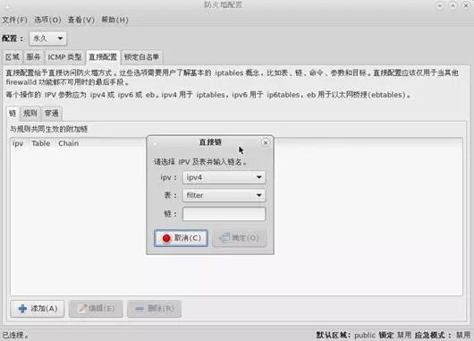 直接配置选项卡包括三个子选项卡:链、规则和穿通见图 9。说明一下这个选项卡主要用于服务或者应用程序增加特定的防火墙规则。这些规则并非永久有效,并且在收到 firewalld 通过 D-Bus 传递的启动、重启、重载信号后需要重新应用。
