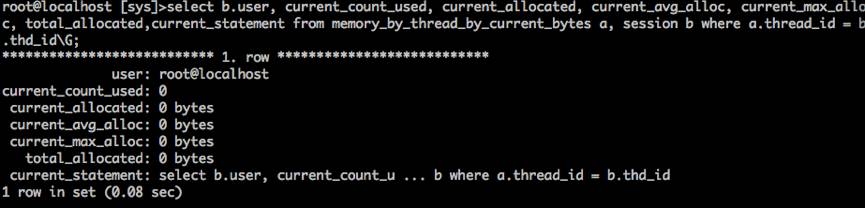 select b.user, current_count_used, current_allocated, current_avg_alloc, current_max_alloc, total_allocated,current_statement from memory_by_thread_by_current_bytes a, session b where a.thread_id = b.thd_id;
