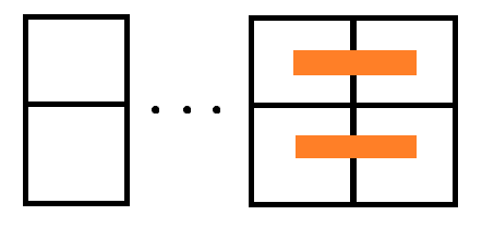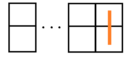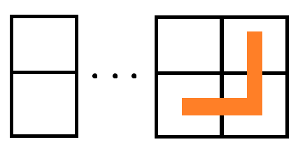 我们可以设 \(f_i\) 为覆盖 \(2\times i\) 的所有覆盖方案。显然,边界条件 \(f_0\)(即没有列了,不用覆盖)和 \(f_1\)(只有 1 列,即一个 \(\text I\) 型砖块竖排)是为 1 的。可以根据最后几列的覆盖方法推导出递推式。