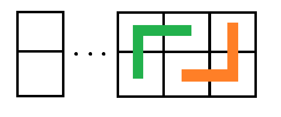 如图,这种情况下,类似情况 1,可以根据 \(f_{i-2}\) 的情况得来,前 \(i-2\) 列覆盖完毕后,忽略情况 1(因为已经计算过了),就只有这种情况了。