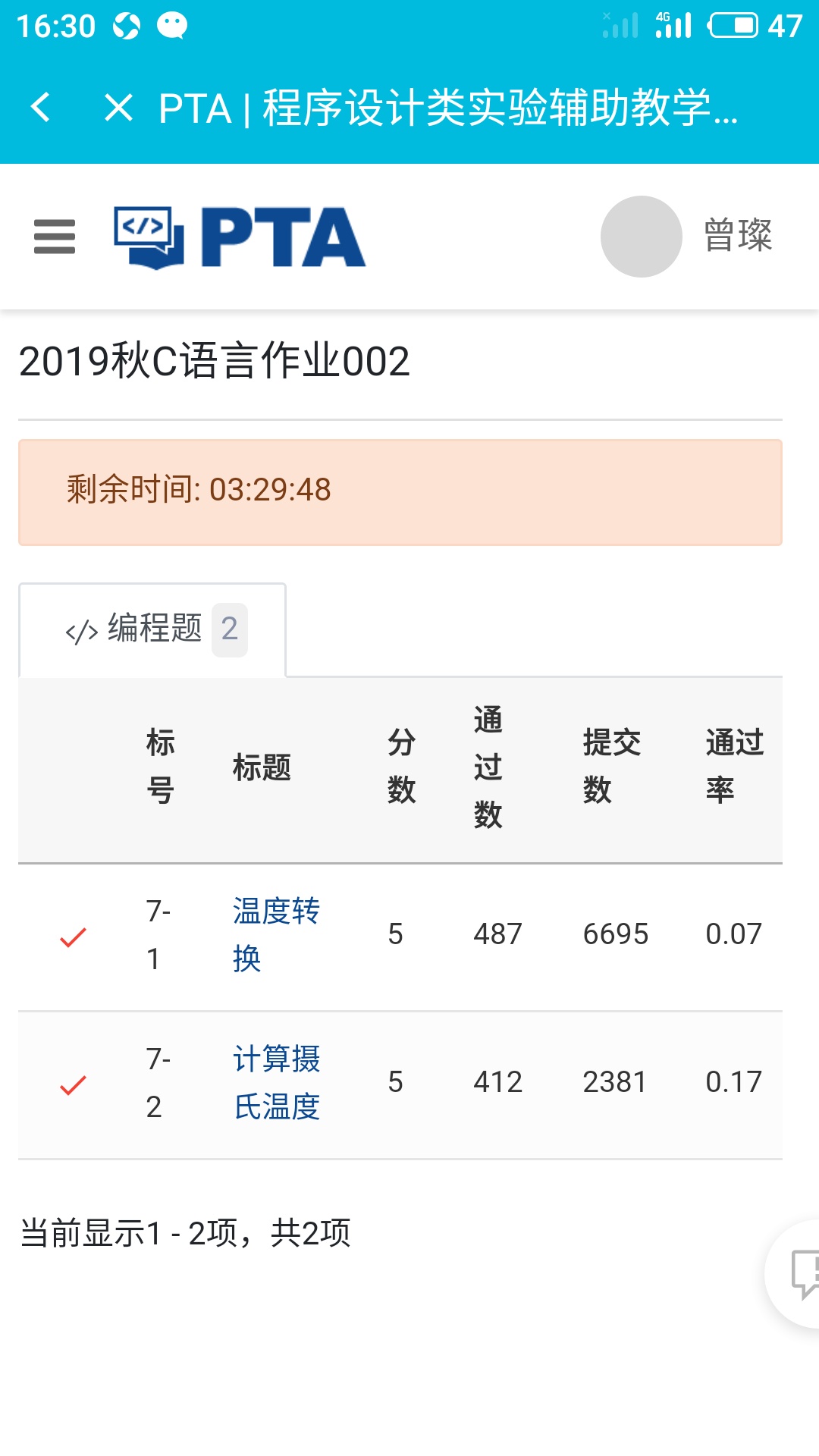 2.2 请完成PTA作业:2019秋C语言作业002。在博客作业中贴出完成图片,图片要求存在自己的名字标识。(2分)