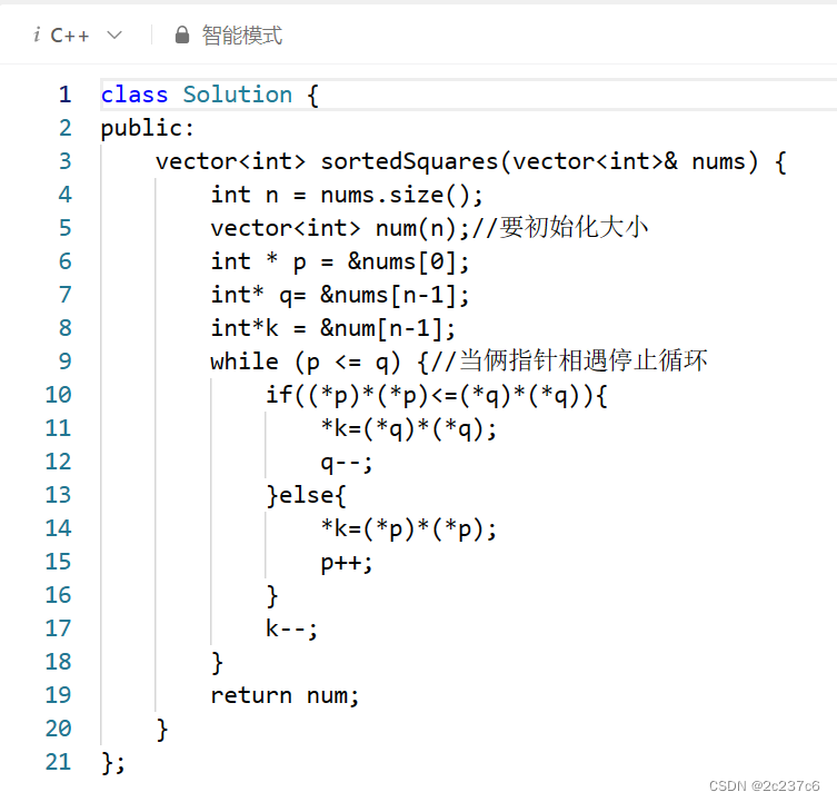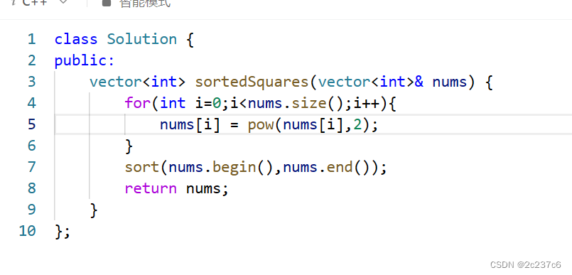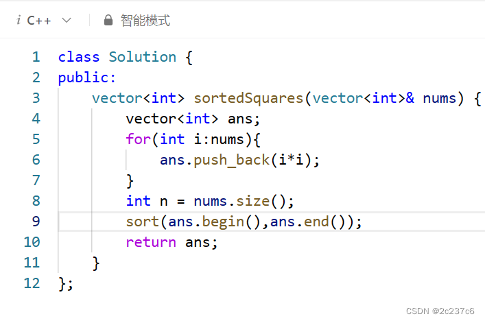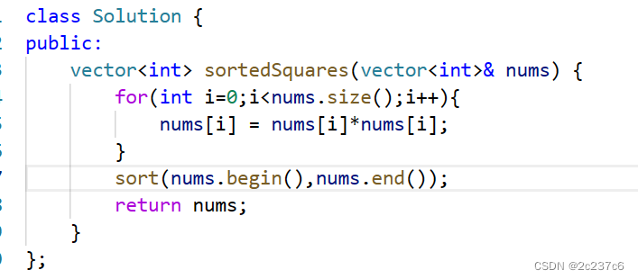 我们定义一个vector容器(由arry容器的底层实现,说白了我就是当成数组用)然后用迭代器迭代 ,这里的 i 指的就是nums容器中的元素,每次循环都回先后移动然后更新 i 的值,然后我们将nums中每个元素的平方push_back到ans容器中,其中push_back又是什么意思呢?很简单就是将 i*i 加到容器的最后面,退出循环后,我们的 ans 中就有我们nums中所有元素的平方了,然后就是我们上面说的负数问题,我们要对我们的数进行排序,因为vector本身带有迭代器的接口所以我们就可以直接ans.bengin()到ans.end()代表我们要排序的范围。